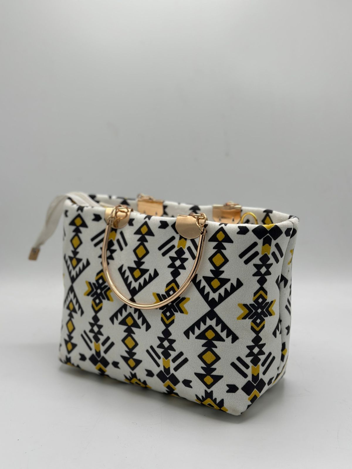 Crafted with premium-quality fabric, the Tribal Print Carry Bag offers both style and durability. The soft yet structured body ensures your essentials remain organized and protected. With comfortable gold-toned handles and an adjustable shoulder strap, this bag gives you complete flexibility, carry it as a handbag for a refined look or switch to the crossbody strap for hands-free ease.