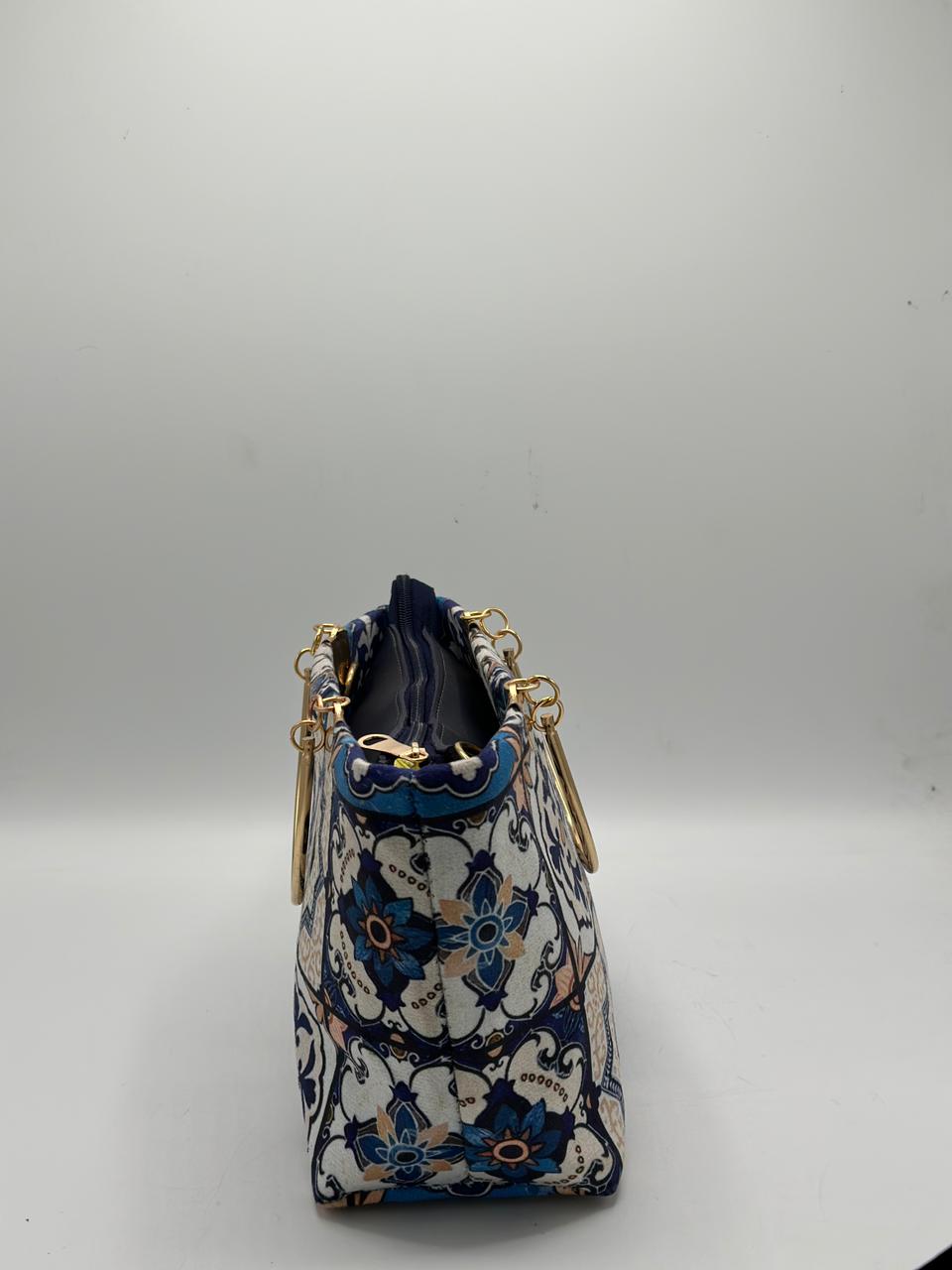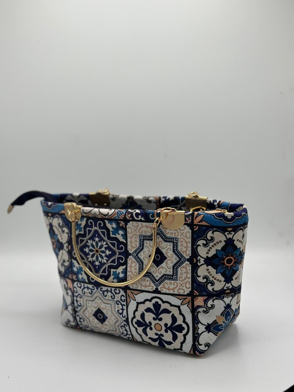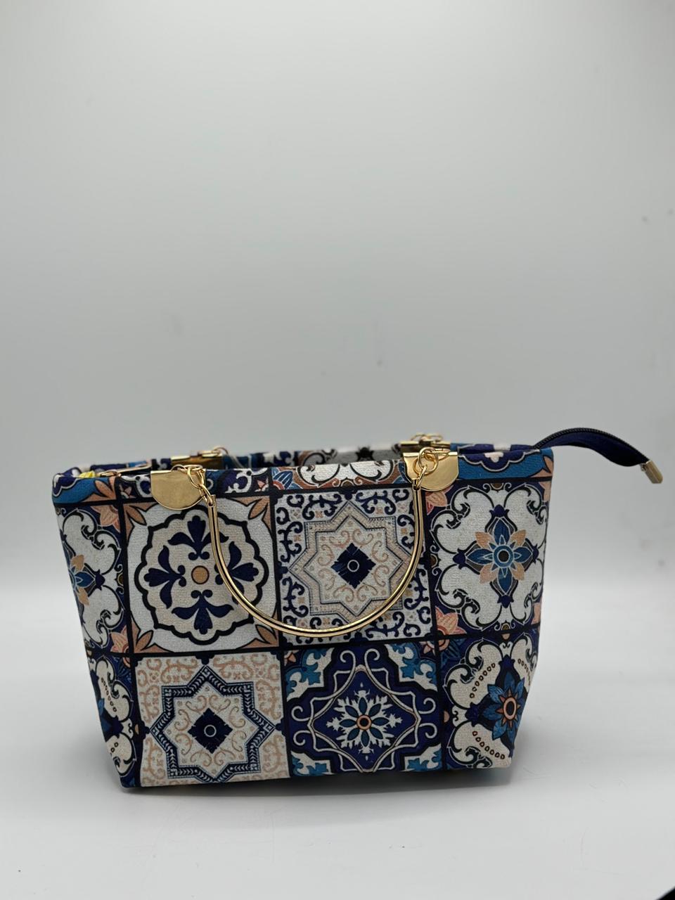 Step into timeless elegance with the Vintage Blue Carry Bag, a graceful blend of classic design and modern sophistication. Inspired by heritage tile and mosaic patterns, this bag showcases soothing shades of blue paired with intricate geometric detailing, creating a refined and polished look.